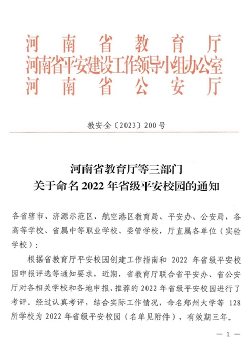近日,河南省教育厅、河南省平安建设工作领导小组办公室、河南省公安厅等3部门联合印发文件,命名我校为“2022年省级平安校园”,有效期3年。经过学校申报、属地推荐、组织考评、实地复核等程序,我校省级“平安校园”通过验收。