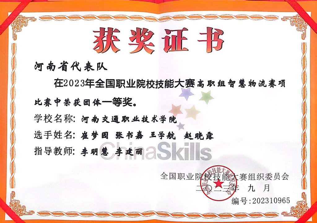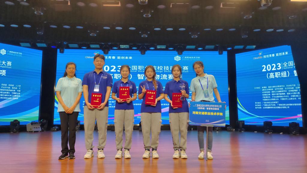 匠心铸就成才梦想,技能创造出彩人生。9月23至24日,2023年全国职业院校技能大赛“智慧物流”赛项在广西职业技术学院举行,来自全国63支参赛队经过两天的激烈角逐,我校物流学院崔梦园、张书嘉、王学航、赵晓露四位同学脱颖而出,斩获国赛一等奖,指导教师李明慧等荣获“优秀指导教师”。这是我校今年在继全国职业院校技能大赛“汽车故障检修赛项”“汽车营销赛项”获得的一等奖后,获得的第三个一等奖。
