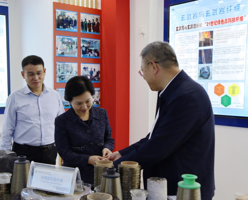 马玉霞首先来到交院工程技术集团的玄武岩纤维科技展厅和超大力值多功能力学试验室,观看展品以及现场模拟实训演示,听取现场讲解。在参观中,马玉霞与学校领导就深入开展产教融合、科教融汇进行交流,对学校“校中厂”育人模式及科教融汇工作取得的成果表示赞赏。