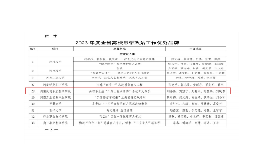 近日,中共河南省委教育工委、河南省教育厅印发《关于公布2023年度全省高校思想政治工作奖评审结果的通知》。经各高校推荐、专家评审、综合评议、公示等环节,我校马克思主义学院报送的《高职军士生“二维三色四品牌”思政育人体系》项目荣获“2023年度全省高校思想政治工作优秀品牌”。