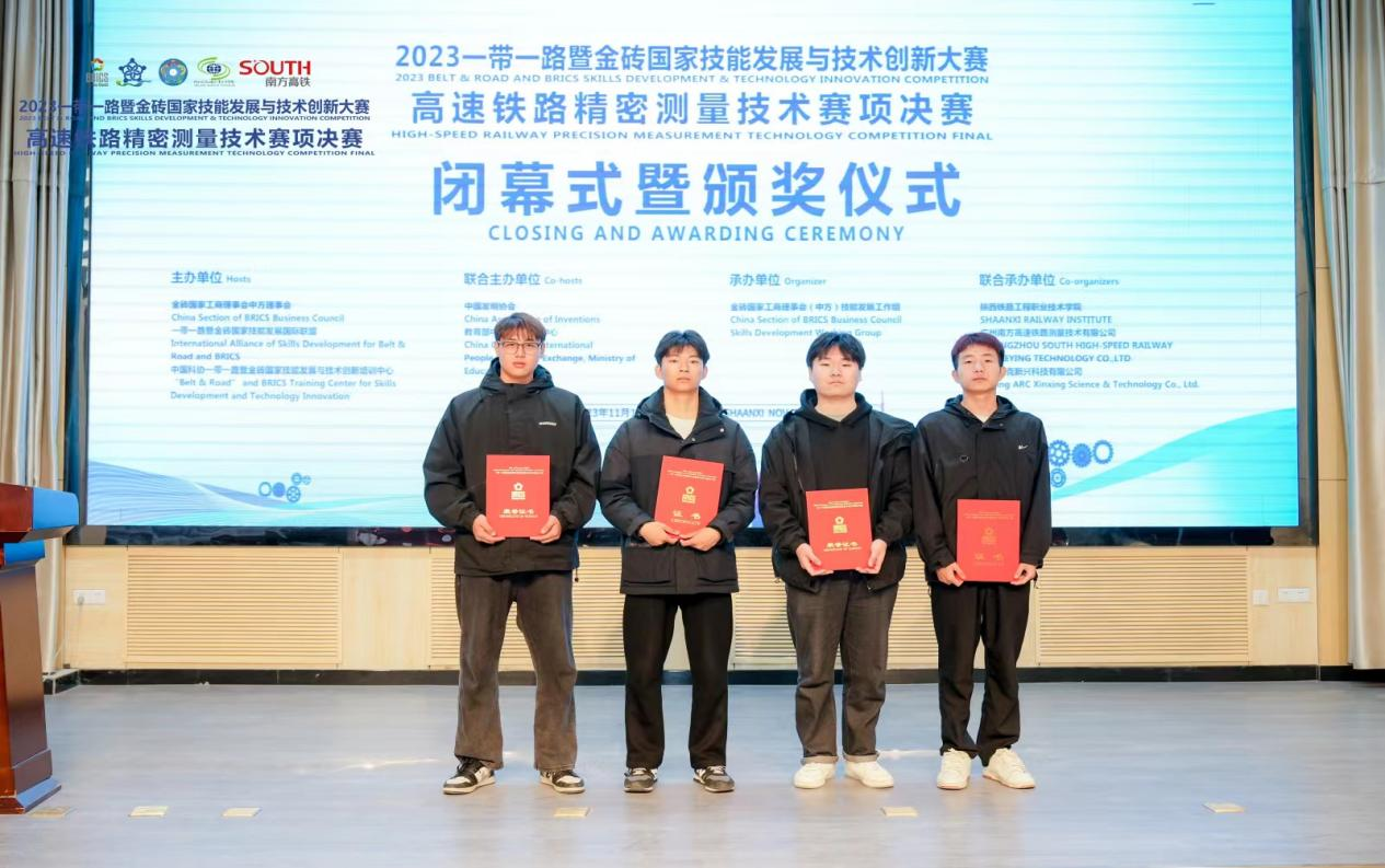 11月17日至20日,第七届“一带一路”暨金砖国家技能发展与技术创新大赛“高速铁路精密测量技术”赛项决赛在陕西铁路职业技术学院举办。来自国内外的39支参赛队、156名参赛选手参加比赛。经过激烈角逐,我校公路学院轨道工程专业刘中杭、张少威、程嘉、赵哲四位同学荣获团体赛二等奖;指导老师都敬丽、孙振华获得“优秀指导教师”荣誉称号,我校获“优秀组织奖”。
