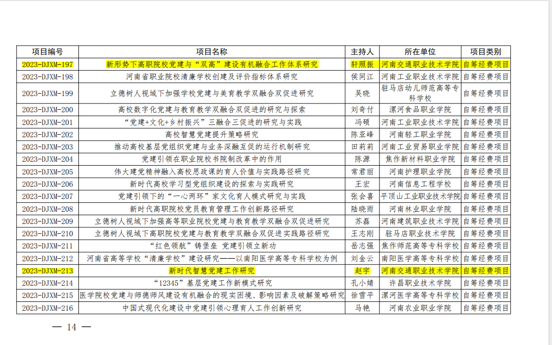 近日,河南省委教育工委办公室、河南省教育厅办公室印发《关于下达2023年度河南省教育系统党建创新项目计划立项的通知》,我校汽车学院教师轩照振主持的《新形势下高职院校党建与“双高”建设有机融合工作体系研究》,马克思主义学院教师赵宇主持的《新时代智慧党建工作研究》喜获省级立项。