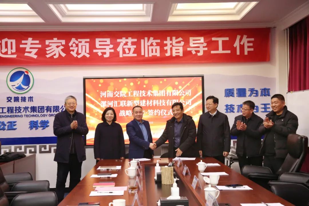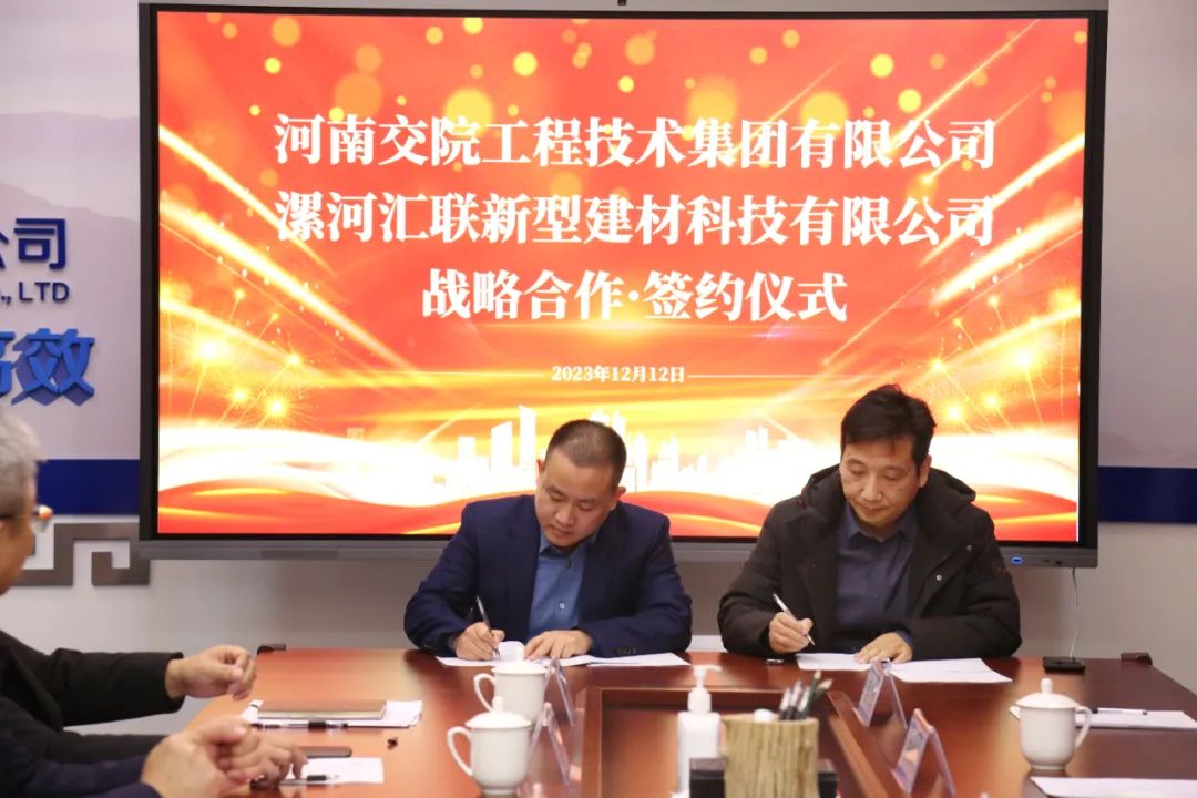 双方基于良好的信任和企业长远发展的业务布局正式签署战略合作协议。河南交院工程技术集团有限公司总经理张永军、漯河汇联新型建材科技有限公司总经理窦耀伟代表双方在合作协议书上签字。根据协议,双方将在人才培养、科技协同创新等方面加强合作,联合开展“四新”(新技术、新材料、新工艺、新设备)技术课题研究,实现资源共享、优势互补,加快科技成果转化,共同为河南高速公路数字化转型升级和高质量发展贡献力量。