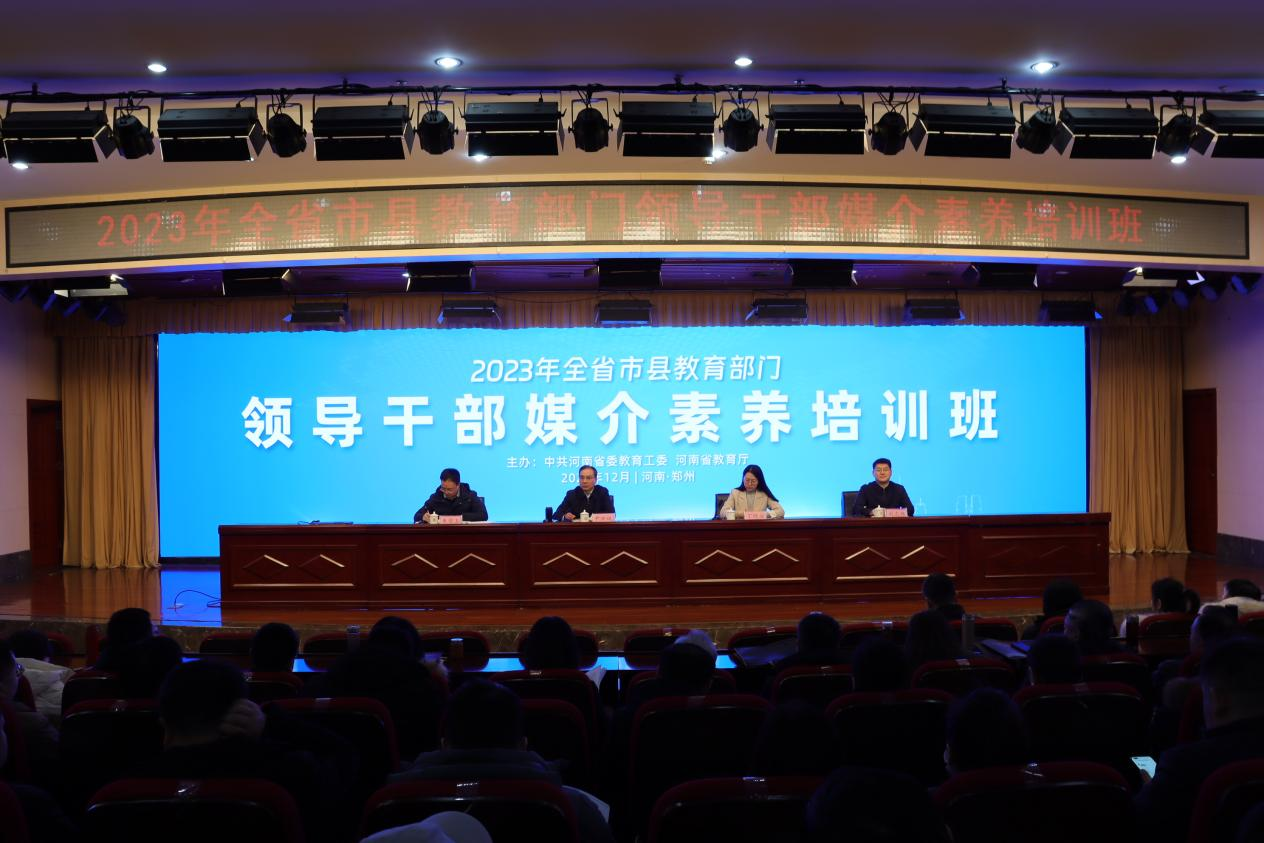 12月12日至15日,2023年全省市县教育部门领导干部媒介素养培训班在我校举办。省委教育工委专职副书记尹洪斌出席开班仪式并讲话,省教育厅二级巡视员黄才华出席结业仪式。党委书记刘志伟,校长焦宏涛分别参加开班仪式和结业仪式。省教育厅机关相关处室、直属实验学校,各省辖市、济源示范区、航空港区、省直管县 (市)、各县(市、区)教育局分管新闻宣传工作的负责同志等200余人参加培训。
