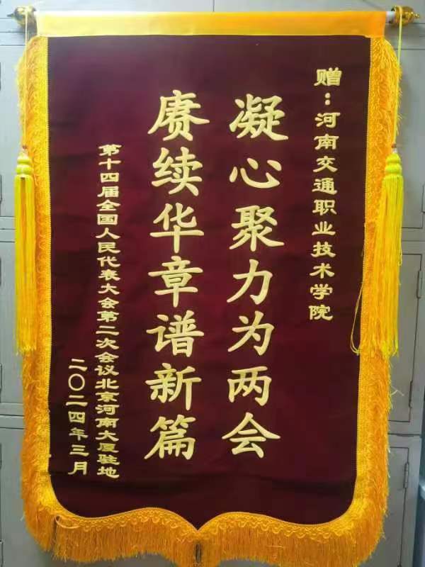 第十四届全国人民代表大会第二次会议召开期间,在北京河南大厦实习的河南交通职业技术学院商务旅游系3名学生因卓越的服务表现,赢得了与会代表和驻地的赞扬。近日,学校收到了北京河南大厦赠送的锦旗。