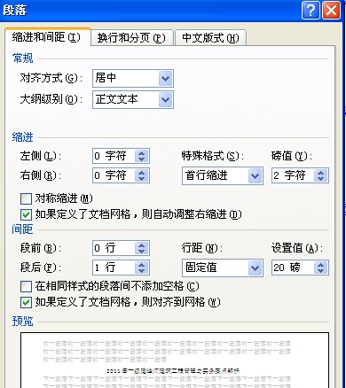 1、文字字体用宋体5号,段落选项中“特殊格式”选择“首行缩进”2字符,“间距”选择“段后”1行,“行距”为固定值20镑。