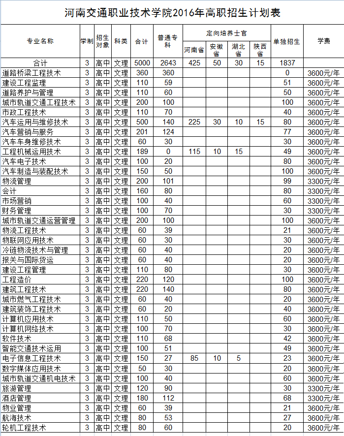 河南交通职业技术学院2016年招生计划