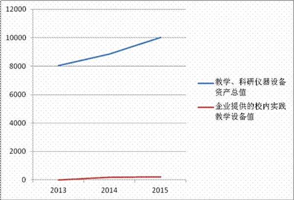 实训基地仪器装备水平逐年提升,教学、科研仪器设备资产总值2013年为8039.75万元,2014年为8852.89万元,2015年为10027.04万元;企业提供的校内实践教学设备值2013年为12万元,2014年为182万元,2015年为207万元。