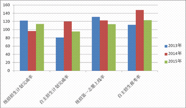 学院招生形势良好,生源质量逐年上升。普通统招招生2013年计划招生数3300人,实际招生4031人,第一志愿报考数5288人,一志愿上线率为131.2%;2014年普通统招计划招生数3000人,实际招生2894人,第一志愿报考数3548人,一志愿上线率为122.6%;2015年普通统招计划招生数2300人,实际招生2622人,第一志愿报考数2969人,一志愿上线率113.2%。自主招生2013年计划招生数700人,实际招生568人,报名数635人,报考率111.8%;2014年计划招生数1200人,实际招生1440人,报名数2129人,报考率147.8%;2015年计划招生数2000人,实际招生1913人,报名数2354人,报考率123%。统招和自主招生报名人数逐年上升,学院招生生源充足。
