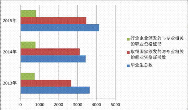 学院积极推行双证书制度,引导学生取得与专业相关的职业资格证书。2013年毕业生3642人,其中2656人取得国家颁发的与专业相关的中高级职业资格证书,732人取得行业企业颁发的与专业相关的职业资格证书,职业资格证书取得率为93.03%;2014年毕业生3428人,其中3110人取得国家颁发的与专业相关的中高级职业资格证书,785人取得行业企业颁发的与专业相关的职业资格证书,职业资格证书取得率为113.6%;2015年毕业生4142人,其中3464人取得国家颁发的与专业相关的中高级职业资格证书,808人取得行业企业颁发的与专业相关的职业资格证书,职业资格证书取得率为103.14%。