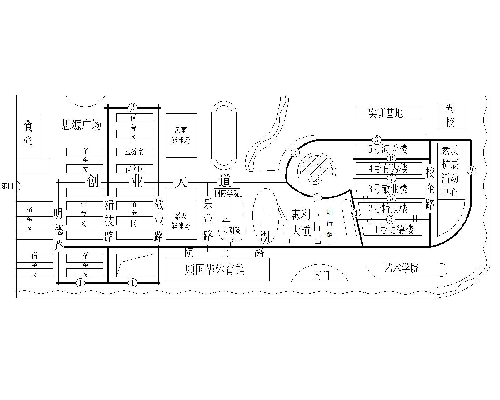 附件:东校区主要建筑及道路示意图(请下载所附大图查看清晰版本)