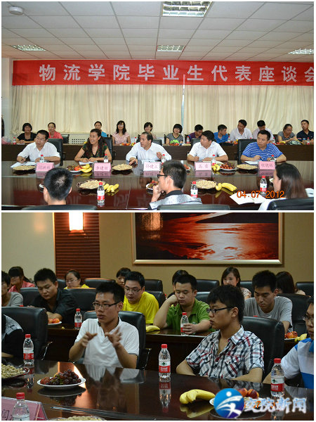 7月4日晚上19:00,物流学院2012届毕业生座谈会在办公楼三楼会议室召开。学院孙建立副院长、物流学院院长、书记、副院长、各专业教研室主任以上人员、辅导员老师及学生代表齐聚一堂,听取了毕业生三年来的学习、顶岗实习经历以及对学院专业建设、师资配备、课程教学、实习指导、学生管理等方面的建议,共同探讨物流学院未来的发展。