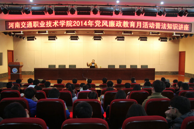 为进一步开展河南交通职业技术学院2014年党风廉政教育月活动,思政部联合团委于12月24日下午在图文中心二楼举办了普法知识讲座,该讲座由思政部教师赵书亚主讲,思政部教师及400余名学生参加。