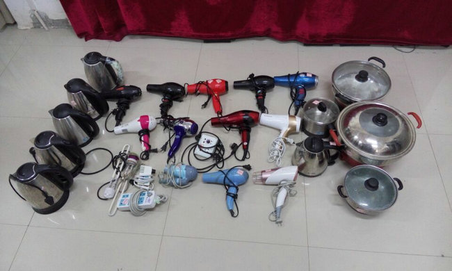 通过检查发现,各院(系)卫生情况总体较好,但部分宿舍存在卫生状况差、物品摆放凌乱、室内有异味等不良现象,个别宿舍仍存在使用电吹风、电热水壶大功率用电器和私设小卖铺等违规现象。通过此次检查,共发现没收违规大功率用电器15个,查处私设小卖铺3间,排除安全隐患8处,宿管科对违纪学生进行约谈及相应处理,并将检查处理结果通报各院(系)督促整改。