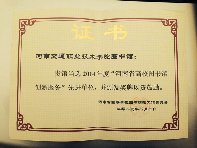 日前,河南省高校图工委对我省2014年在“创新服务”方面做出突出成绩的图书馆进行评选表彰,学院图书馆在此次评选表彰活动中荣获河南省高校图书馆“创新服务先进单位”,同时有王怡心等三位同志荣获“先进工作者”称号。