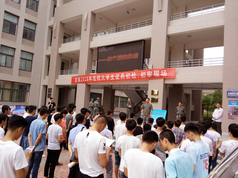6月1日下午2:30,学院根据征兵归属地二七区武装部安排,在新校区交通信息工程系一楼教室,进行2016年我院在校大学生征兵初检、初审工作。二七区武装部洪涛科长,张志军参谋及相关工作人员到学院为我院首批52名应征报名大学生进行初检初审。