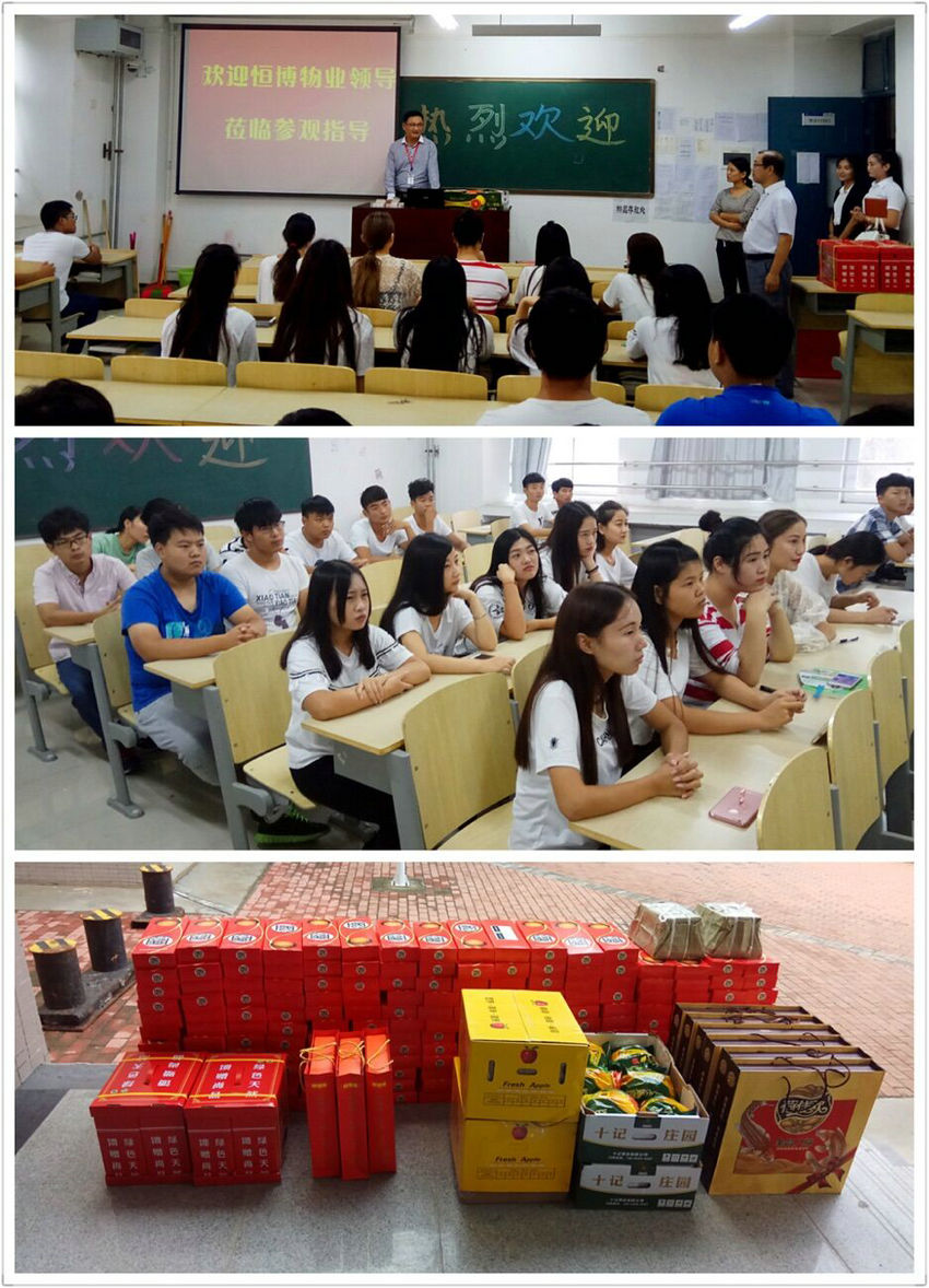 9月13日,中秋节前夕,深圳市恒博物业管理有限公司郑州航空港区分公司总经理魏小允一行来到学院,看望物业管理专业15、16级学生,并为大家送上中秋节的慰问礼品。