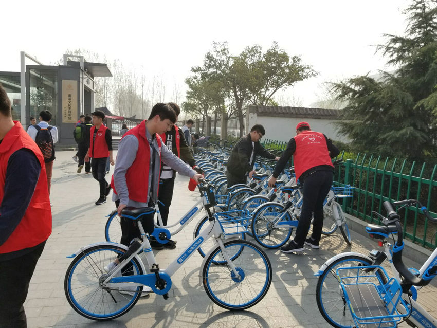 志愿服务队分成两个小组,在各出站口附近对共享单车进行梳理,把路边倒地的单车主动扶起,将占道、乱停乱放的共享单车归位,统一有序地摆放到指定停放区域,同时向过往市民宣传文明出行、按规停放的出行使用理念。
