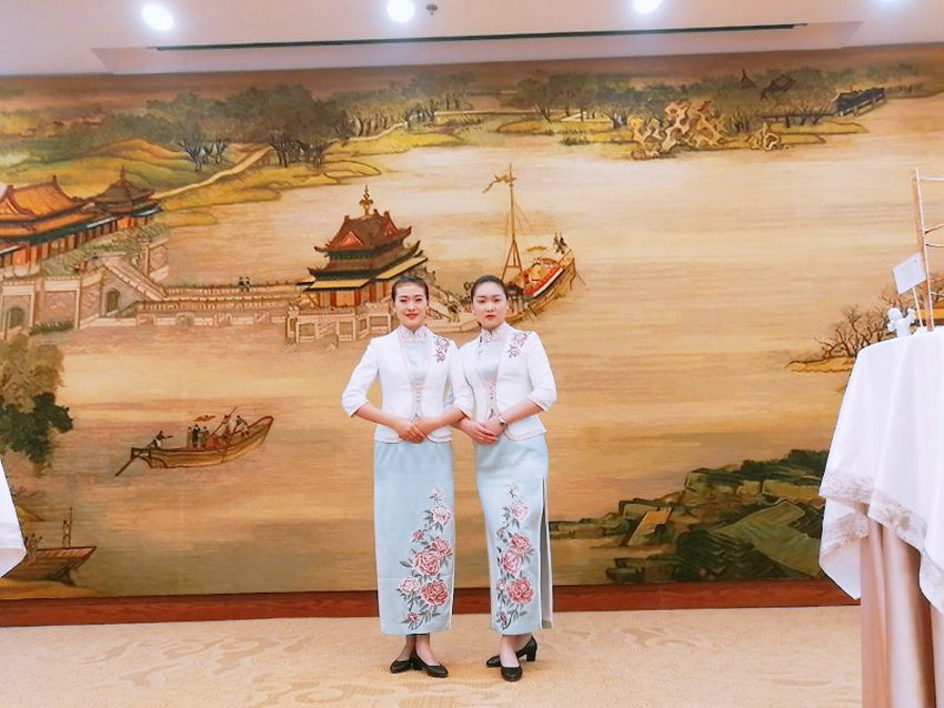 通过层层选拔,在黄河迎宾馆实习的商务旅游系酒店管理专业学生常云帆、王雪纺同学有幸入选了此次河南省全球推介会的接待工作。为顺利完成本次国家级接待任务,两位同学进行了为期3个月的严格训练。活动现场,两位同学尽职尽责、认真专注,用专业、周到的服务顺利完成整场接待。