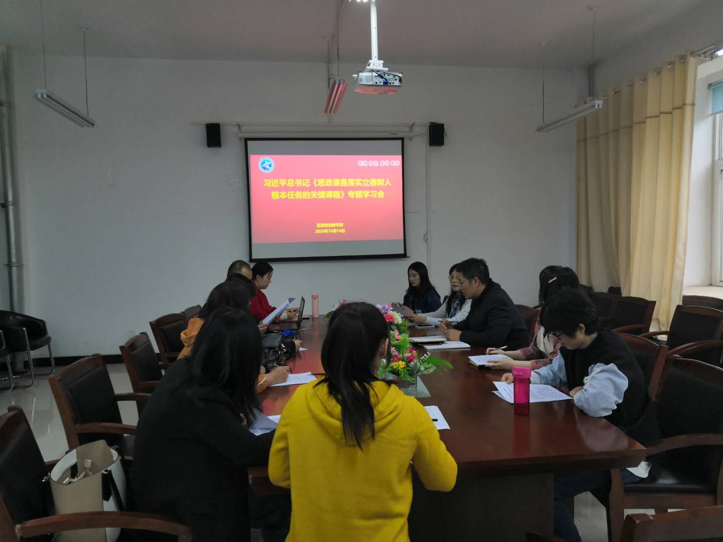 10月14日下午,思想政治教学部在思政部会议室召开了关于习近平总书记《思政课是落实立德树人根本任务的关键课程》重要文章专题学习会。思政部全体教师参加会议,会议由思政部主任刘喜要主持。