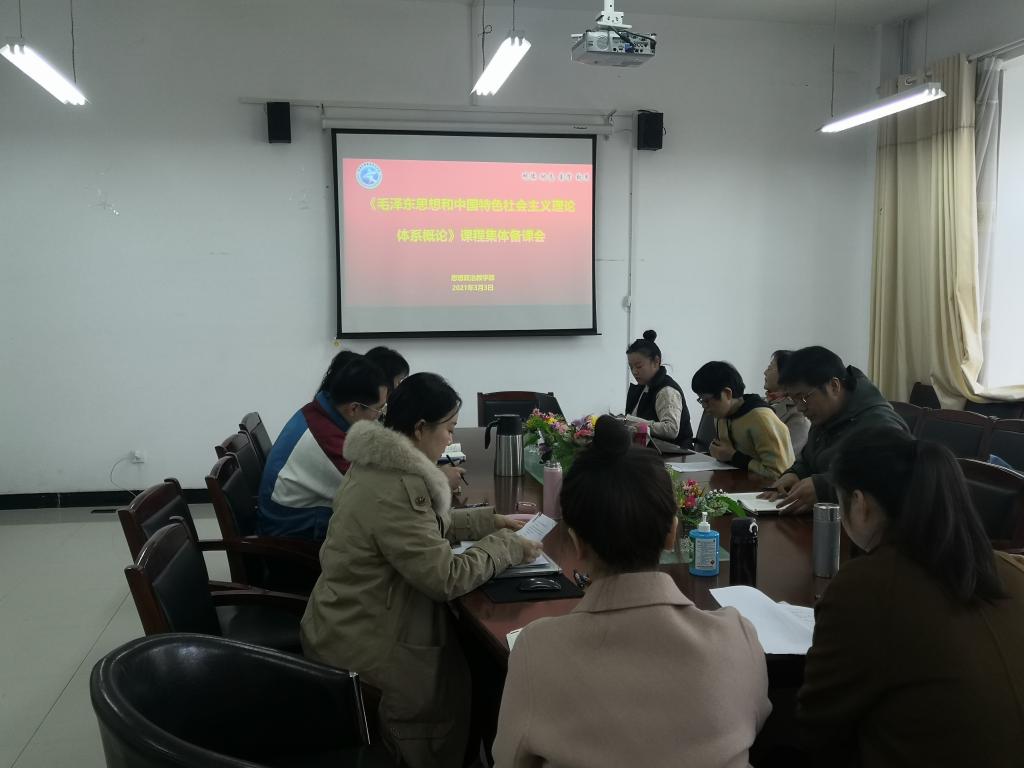 3月3日全天,思想政治教学部在思政部会议室召开《毛泽东思想和中国特色社会主义理论体系概论》课程集体备课研讨活动,课程全体专兼职教师参加会议,会议由课程教研室主任于卫雁主持。