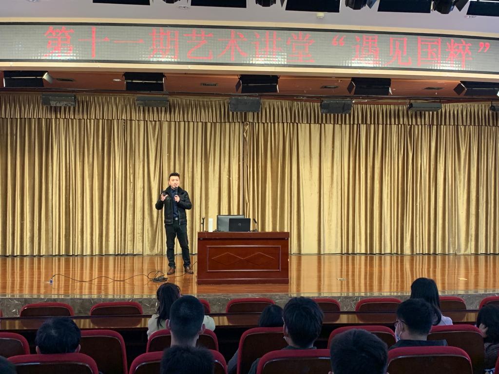 近日,由文艺体育部、团委共同举办的第十一期艺术讲堂在图书馆二楼报告厅开讲。本次活动邀请到了河南京剧艺术中心杲翔老师主讲,学校四百余名师生参加了本期艺术讲堂。
