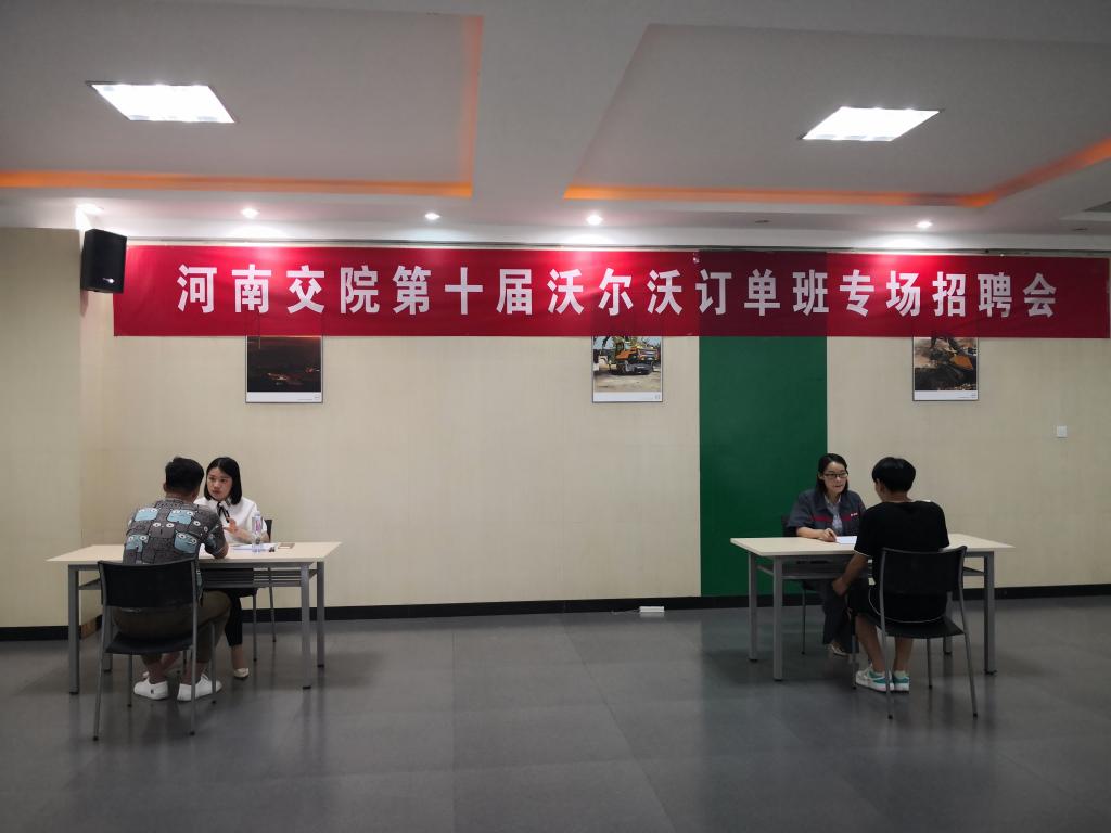 随后,举行了第十届沃尔沃订单班专场招聘会。河南通冠集团代表旗下的子公司—河南沃通、通冠重工、通冠高空平台租赁股份有限公司等几家单位,为学生提供工程机械售后服务、营销、配件支持、营销支持、高空平台作业服务等相关岗位,最终有近30名2019级工程机械运用技术专业学生与招聘单位达成了就业意向。