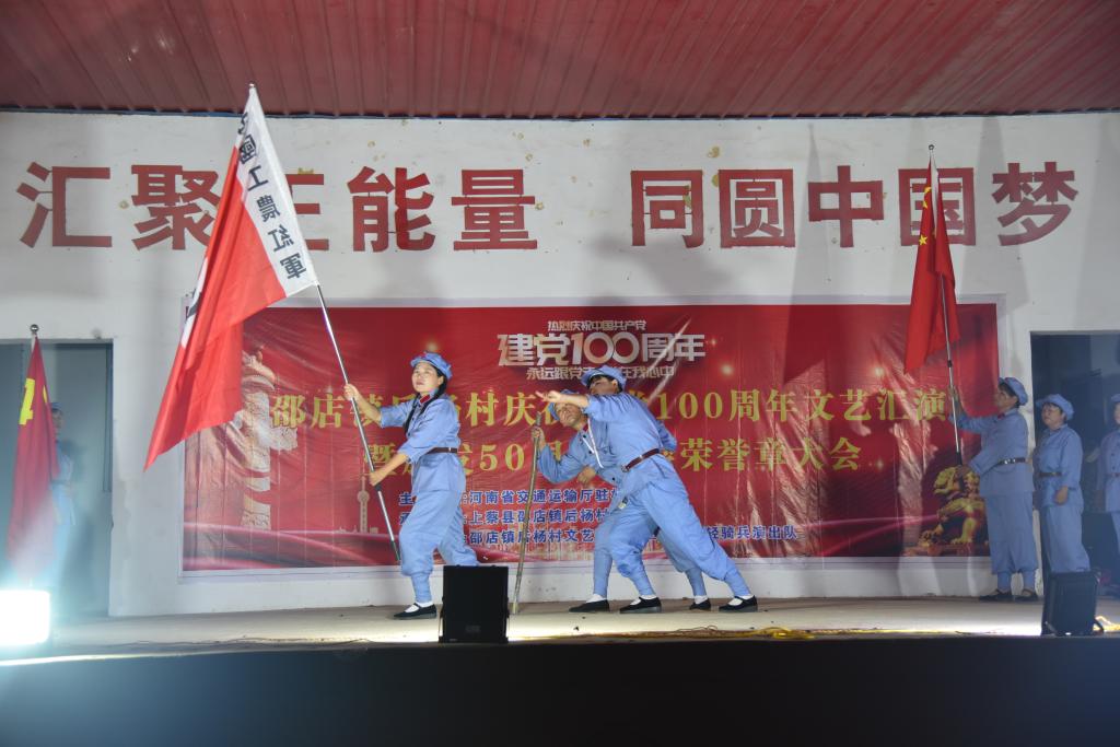 筚路蓝缕创伟业,初心不忘再起航。6月30日晚,学校驻后杨村工作队“庆祝中国共产党成立100周年文艺演出暨颁发‘光荣在党50年’纪念章活动”在后杨村文化活动广场举行。上蔡县委宣传部、邵店镇党委书记、镇长等县镇领导、后杨村驻村第一书记和村“两委”干部共600余名群众一起观看演出。