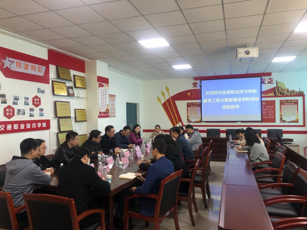 3月2日上午,郑州信息职业技术学院建筑工程与智能建造学院院长王新生、学院书记季广辉、副院长朱晓刚等一行8人到建筑工程系考察交流。建筑工程系主任王永、党总支书记谭萍、系副主任郑云鹏、施钧及各科室负责人参加了座谈交流会。