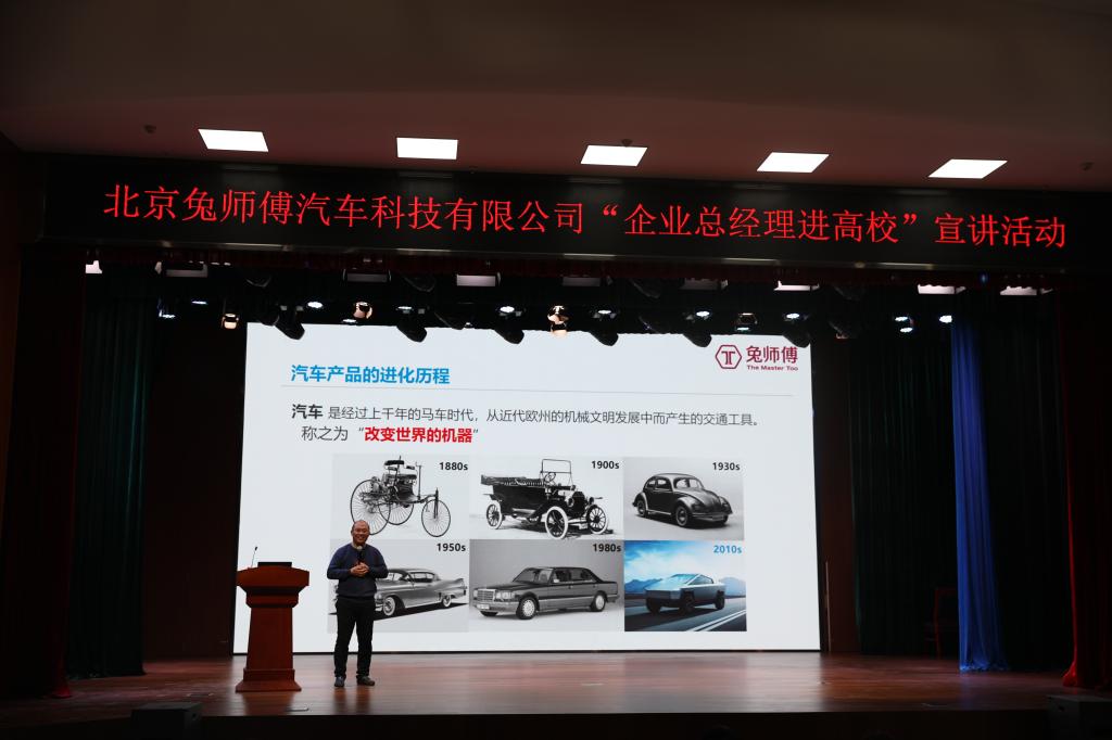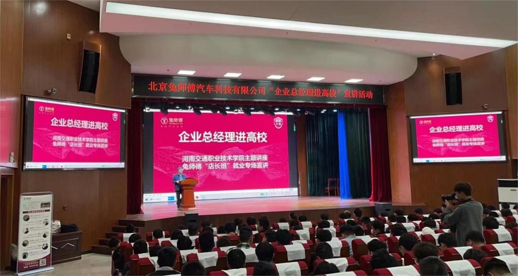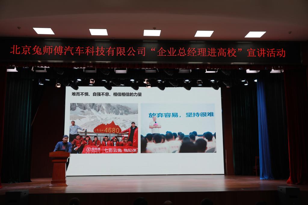 下午14时,北京兔师傅汽车科技有限公司与汽车学院联合在航海路校区艺术中心报告厅进行了“企业总经理进高校”宣讲活动,300余名学生参加活动。活动中,王真为大家带来“中国汽车后市场分析”讲座;兔师傅人力资源总监李少博详细介绍了店长班规划;郑州兔师傅中牟学苑路店/郑州白沙店创业店长汽车学院优秀毕业生王燕飞,分享了他的个人职业成长经历,为同学们未来的实习、求职提供了新思路。