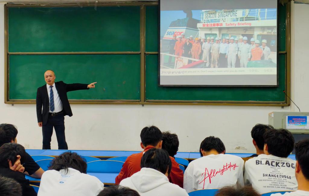 4月7日下午,航运海事系在善学楼4B210举办“名企进校园、船长进课堂”活动暨“迎春招、促就业-适应未来航海生活”航海专题就业双选会,邀请青岛海洲星船员服务有限公司沈爱兵船长到校宣讲,航运海事系全体大二学生参加。