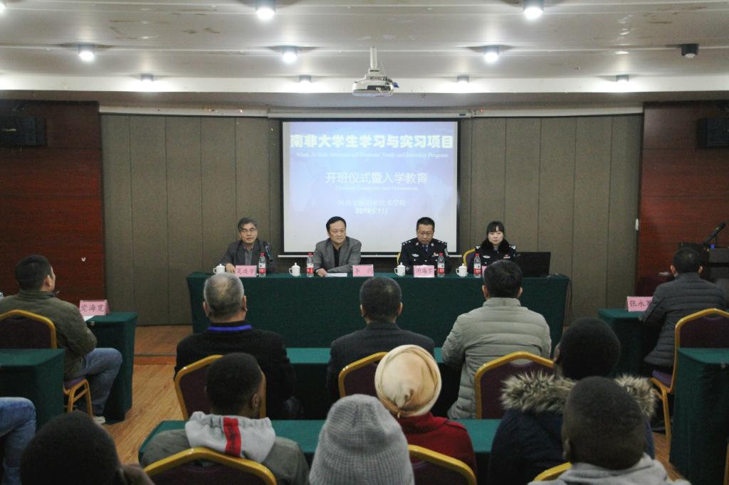 近日,南非大学生学习与实习项目开班仪式暨入学教育在学院航海校区举行。郑州市公安局出入境管理处副处长汤海军、指导员钟丹、院长李强、副院长夏连学及相关部门负责同志出席开班仪式。仪式由夏连学主持。
