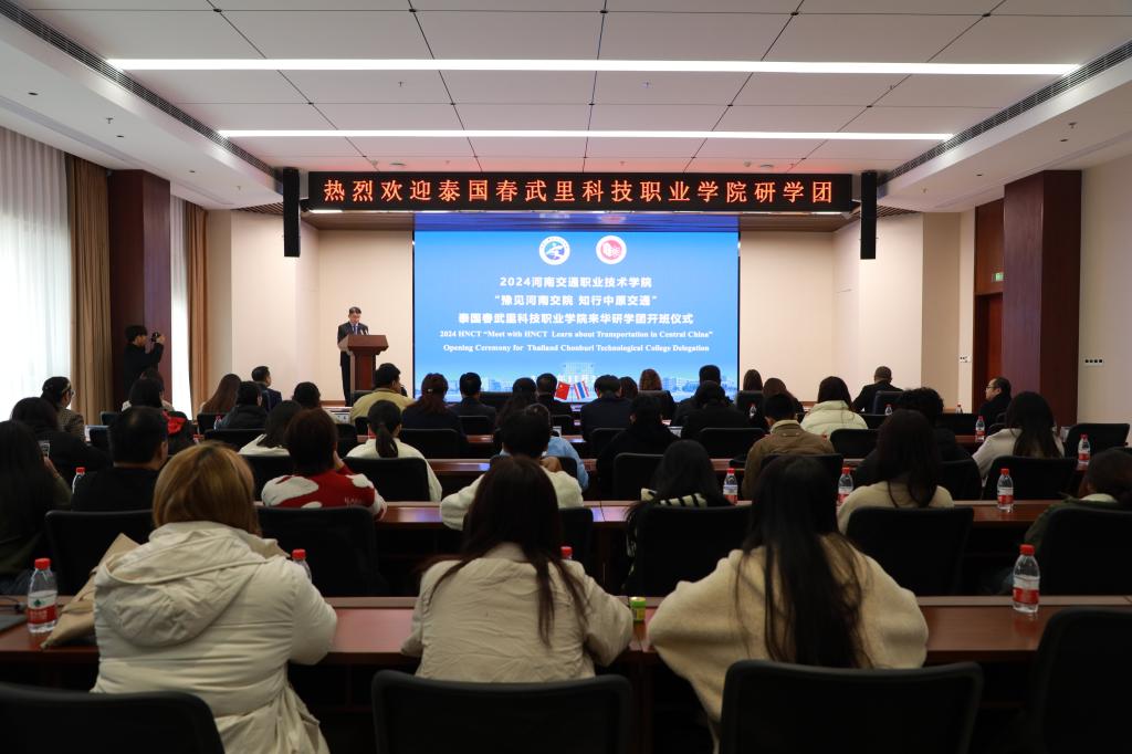 开班仪式上,焦宏涛首先对参加本次研学活动的泰方师生表示热烈的欢迎,简要介绍了学校的基本情况,表示将以“行走河南+实践体验”的方式让泰方师生解中国文化、河南文化,充分感受华夏文明和河南交通的魅力,爱上河南、爱上河南交院。他希望,两校以此次活动为契机,加强中泰青年学生之间的交流互动,共同促进中泰文化交流、技术技能共享、人才培养合作,为共筑中泰美好未来、共建中泰命运共同体贡献力量。