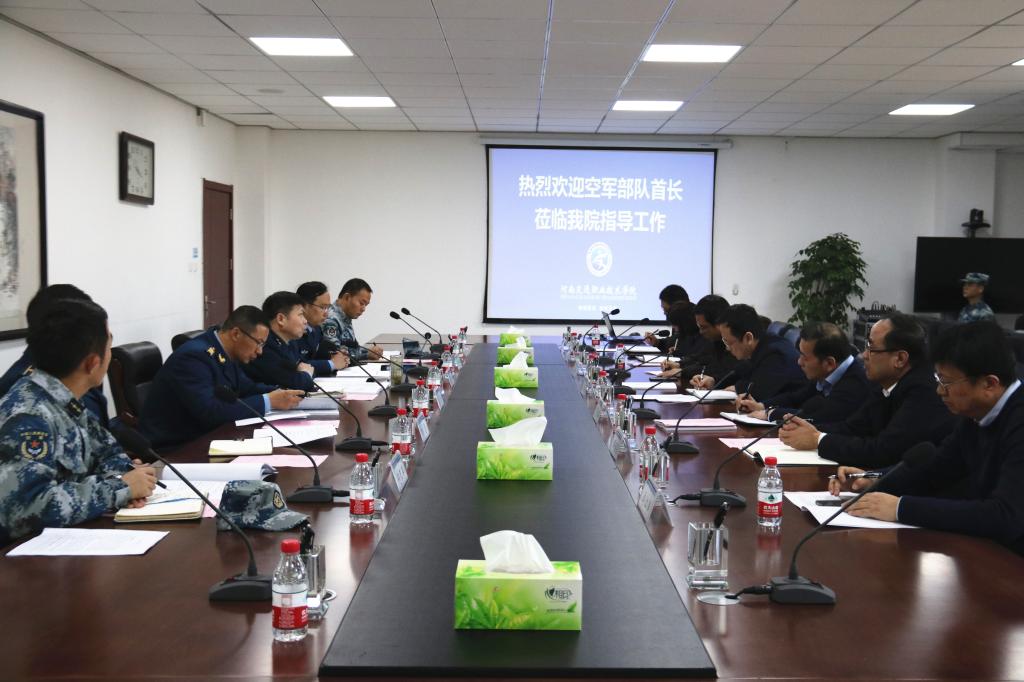 省交通运输厅副厅长唐彦民,在校党委书记曹焱陪同下与调研组进行了愉快交流。库流平介绍了本次调研的目的,在军民融合的大背景下,做好定向培养士官工作的大文章,在纵向和横向同步拓展;发挥学校优势,能够多方位服务空军部队建设。唐彦民介绍了河南交通服务军民融合工作开展情况,充分肯定了学校定向培养士官工作已成为塑造河南交通军民融合品牌,为服务国防建设和军民融合发展,注入了新的内涵,增添了新的亮点。希望空军部队继续支持学校、指导学校,促进学校军民融合工作加强深度,扩大广度。