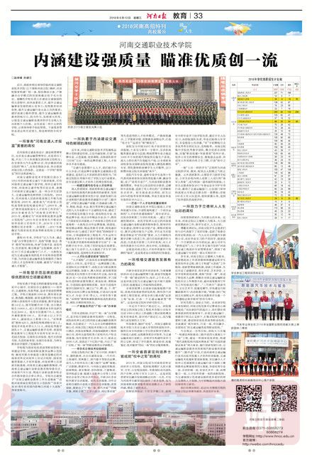 近日,省政府相关领导莅临河南交通职业技术学院(以下简称河南交院))专题调研,对该校探索构建厂校一体、股份制双主体、产教融合办学模式的经验和做法给予充分肯定。她嘱托学校负责人在建设交通强国的伟大进程中,培养高素质人才,提升交通运输事业发展的核心竞争力;发挥教育培训优势,提升交通运输行业从业人员的素质;建好高速公路科普馆,提升交通运输职业教育的吸引力,担当作为,发挥更大作用,让接受交通运输职业教育的学生实现人生出彩和个人价值。这究竟是一所什么样的学校,让省领导寄予如此厚望。下面记者带你走进这所历史悠久、特色鲜明的专科学校。 一所享有“河南交通人才摇篮”美誉的高校 在河南省交通系统设计、建设和管理单位,无论是交通运输管理单位,还是项目工地,不出三个人你准能见到河南交院校友;在全省各大汽车品牌4S店,你会碰到河南交院的“熟人”,在知名物流企业,你会看到河南交院人的身影。这就是一个学校“看得见”的历史和影响力。 河南交通职业技术学院源自创办于1953年的河南省交通厅干部训练班,历经河南省交通运输干部学校、郑州交通专科学校、河南省交通学校等历史沿革,隶属于河南省交通运输厅,是一所办学历史悠久、交通运输特色鲜明的工科院校。2004年,经河南省人民政府批准独立升格为高职院校;2008年,被批准为“河南省示范性高等职业院校建设单位”;2009年,通过“教育部高职高专人才培养工作评估”;2014年被命名为“河南省文明单位”;2015年,被确定为“河南省职业教育品牌示范院校”;2015年在全省率先开展定向培养直招士官培养工作,2016年士官生规模位居全省第一,全国第二,2017年被确定为国家级优质高等职业院校立项建设学校。 建校65年来,学校在“以人为本、通达于道”办学理念指引下,发扬“明德 励志 善学 致用”校训传统,传承“自强不息、奋发有为、经世致用、唯实唯新”交院精神,培养了近10万名交通运输专门人才,一大批校友成为交通运输系统的技术专家和各级管理干部,为河南交通运输事业发展提供了强有力的人才支持和智力保障,被誉为“河南交通人才摇篮”。 一所彰显示范品牌的国家级优质院校立项建设高校 学校坐落于华夏文明的重要发祥地、国家中心城市、全国综合交通枢纽——郑州市,交通便利,风景秀丽,是求学创业的理想之地。学校占地面积1086亩,拥有郑东新区、航海路、桃源路、新郑龙湖等四个校区和济源小浪底校外大型实训基地,教学设备总值1.6亿元,图书馆藏书80 万册,全日制在校生15000人,成人学历教育本专科及研究生近2000 人。现有专任教师775人、校内外兼职教师190人。其中硕士以上学历398人,副高级以上职称176人,“双师素质”教师420人,国务院特殊津贴专家1人、省级学术技术带头人11人,省级优秀教学团队4个,交通运输职业教学名师、省部级职业教育与工程技术专家库专家30余人。花园式校园、完善的实训场馆、现代化的图书馆、先进的体育馆、全国百佳食堂,为师生修身治学提供了优越条件。 学校现为国家级优质高等职业院校立项建设学校、河南省职业教育品牌示范院校、解放军联合参谋部与国家教育部确定的河南省首所定向培养士官试点院校、国家技能型紧缺人才培养基地,河南省博士后创新实践基地,河南省交通运输职教集团、河南省交通运输行业职业教育指导委员会、河南省汽车行业、物流行业职业教育校企合作指导委员会牵头单位。学校先后被授予“全国交通职业教育工作先进集体”、“首批河南省诚信规范招生示范院校”、“河南公众最满意的十佳高职高专院校”、“河南最具影响力的十大教育品牌”、河南最具就业竞争力领军高校”、“改革开放40周年具有国内影响力河南十大高校”等荣誉称号。 一所执着于内涵建设交通特色鲜明的高校 近年来,河南交通职业技术学院凝炼品牌示范校建设经验,立足内涵发展,打造“品牌专业、示范基地、优质课程、名师团队和学习空间”五位一体的品牌质量工程,人才培养水平逐年提高。 “交通行业需要什么人才,我们就开办什么专业;打造品牌专业服务交通强国示范省建设,是我们义不容辞的责任和担当。”河南交院院长李强介绍了学院立足行业需求,在专业建设和人才培养上的理念和经验。 ——构建交通特色专业人才培养链 深入贯彻国家、省政府和省交通运输厅关于加快发展现代职业教育的新要求,坚持交通运输职业教育攻坚计划、创新发展行动计划和现代职业教育质量提升计划 “三路并进”,对接交通运输产业链,打造涵盖公路、汽车、物流、轨道、水运、航空等多种交通运输方式的九大专业群43个交通特色专业,建成了中央财政支持重点专业、省级特色专业、优势品牌专业、校企合作精品专业25个;拥有3个国家级实训基地、6个河南省示范性实训基地和一大批校企合作品牌基地,省部级、校级精品课程、精品资源共享课、网络通识课程80余门;建成了获评“省优”的网络学习空间,立项道路桥梁工程技术、汽车运用与维修技术等9个专业教学资源库,搭建了融“专业教学资源库和网络教学空间”于一体的数字化平台,实现了时时处处在线课堂,线上线下互动学习,大大提高了学生学习的兴趣和深度,受到师生欢迎和好评。 ——人才队伍建设瞄准“国际范” “人才强