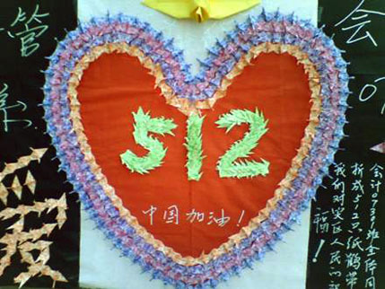 08年6月1日下午,在这个特殊的日子里,河南交通职业技术学院经济管理系会计07301班的学生代表来到收治四川地震伤员定点医院――郑州市骨科医院,探望灾区小朋友。在“心连心”病房里,同学们将自己亲手制作的代表着爱心与祝福的512只千纸鹤 “心”形图案送给了正在养伤的灾区小朋友,看着孩子脸上洋溢的笑容,大家由衷地相信:在全国人民的关怀和帮助下,他们的未来会更灿烂,灾区的明天会更美好。