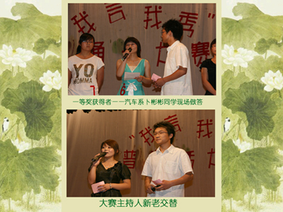 此次比赛得到了全院同学的热情参与,共有来自4个系的12名选手进入决赛,比赛方法一改常规,采用了多媒体出题计时的方法,为大赛的顺利进行提供了便利。赛场上,选手们用一口流利标准的普通话及灵活的应变能力通过了所有5个环节的比赛,特别是在第5个模拟面试环节,选手们面对“面试官”提出的求职问题沉着应变、冷静作答,给场下的评委和观众留下了深刻的印象。最终来自汽车系的卜彬彬同学以自己优异的表现取得了大赛的第一名。赛后评委鹿燕老师对我们的比赛做了精彩的点评并亲自为得奖的选手颁发了荣誉证书。