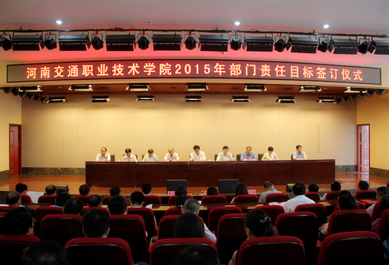 仪式上,学院领导代表学院与分管部门负责人依次签订责任目标书。2015年各部门目标责任书的制定按照科学、规范、实事求是的原则,将学院的总体规划与部门的工作目标任务紧密结合,涵盖了重点工作目标、职能任务目标、创新发展目标、共性要求目标四项目标,主要涉及治理体系和治理能力建设、人才培养能力建设、社会服务能力建设、干部和人才队伍建设、基础设施建设、党建和意识形态阵地建设等六项内容。