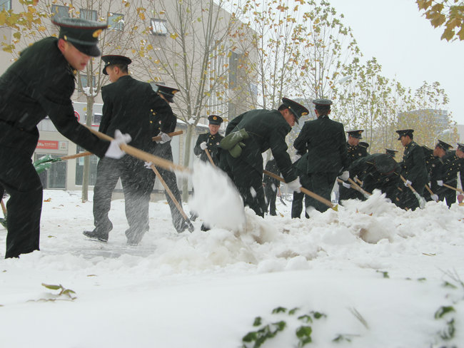 持续的大雪给中原大地披上了美丽的雪衣,皑皑白雪中,一抹橄榄绿在新校区显得格外耀眼。原来,为了保障老师同学们的顺利出行,消除安全隐患,今天早上7点开始,士官生们就自发组织起来,划片分区开始了清雪工作。一把扫帚,一把铁锨就是他们的“作战武器”。凛冽的寒风裹挟着片片飞雪扑打在他们的脸上、手上,但这丝毫阻挡不住他们扫雪的热情,他们挥舞着手中的铁铲、扫把清扫着路面的积雪,到处是一派热火朝天的景象。他们不畏严寒、干劲十足的扫雪身姿也感染了过往的师生,很多人也自愿加入到了扫雪队伍。