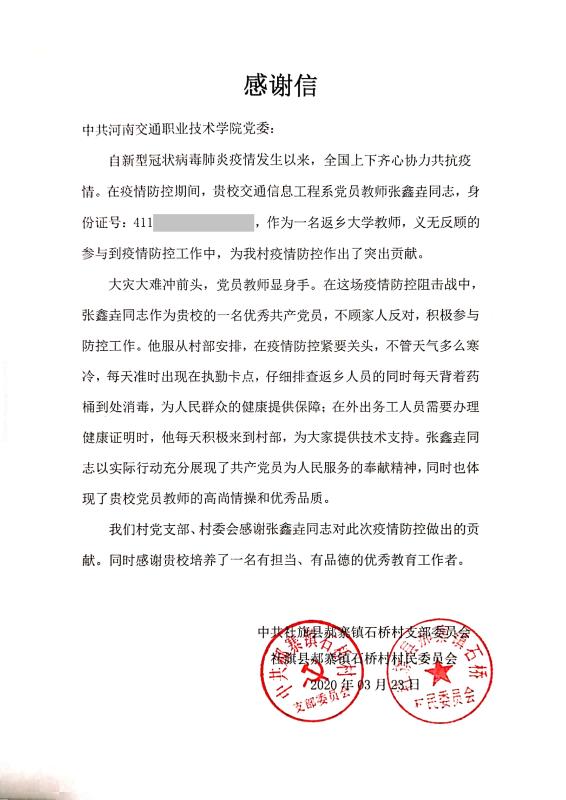 在这场疫情防控战争中,教师党员们率先响应学院党委号召,不仅积极联系学生,做好学生疫情防控统计工作、为抗疫捐款捐物,更是走出家门,参与地方防控,张鑫垚老师就是其中一员。张老师在社旗县石桥村不仅参与卡点的执勤工作,更是应用其专业技能特长为该村提供计算机、网络技术支持。学生党员们也争做表率,积极担当,在校学生党员高源在禹州市郭连镇政府报名成为了一名志愿者,不仅在镇里参与了巡回宣传工作,也服从当地分配安排,走进张涧村参与疫情防控执勤工作。毕业生党员们也牢记党员的初心和使命,2019届毕业生党员张绍冲在台前县积极参加防疫志愿活动,并受到台前县团委表彰。