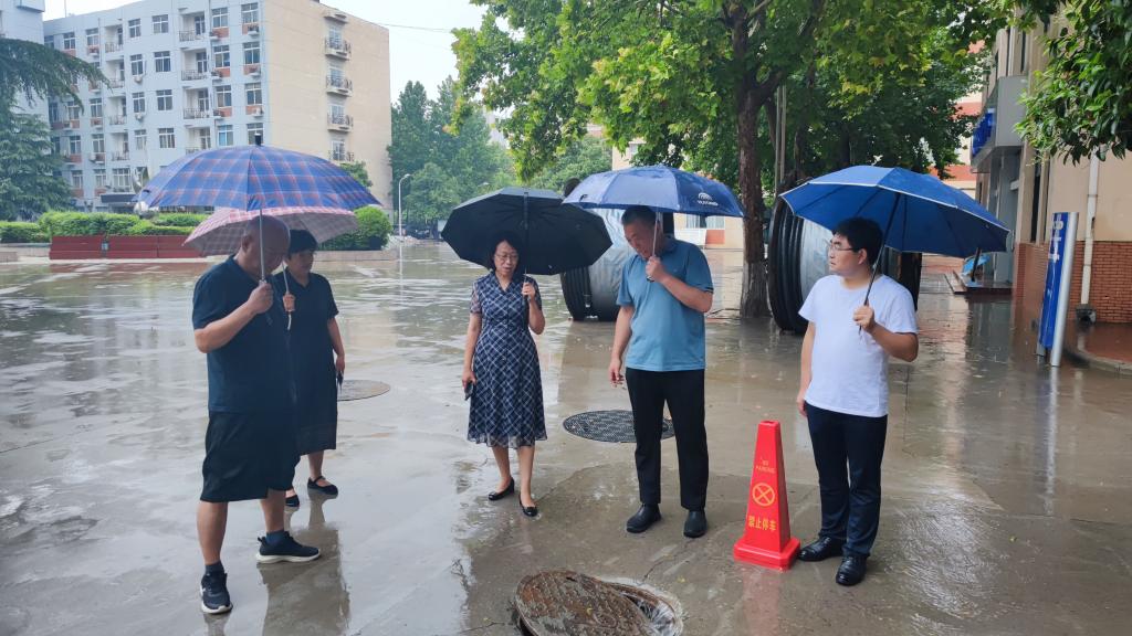 7月22日下午,郑州市发布暴雨橙色预警信号,校党委书记曹焱冒雨到航海路校区督导检查防汛工作。校工会主席朱学军陪同督查,汽车学院、航海路校区综合管理办公室、职业技能鉴定中心等部门负责人参加督查。