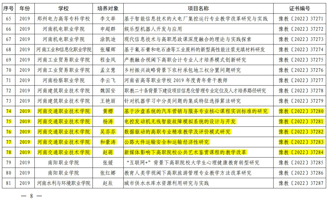 河南省高等职业学校青年骨干教师培养计划坚持以项目为载体,突出重点领域,坚持将培养人和支持项目有机结合的原则,是优化学校教师队伍结构、提高教师队伍整体素质、积极推进“人才强校”的人才项目。我校入选的8名省级青年骨干教师培养对象,在培养期间高质量完成了专业教学、项目研究、团队建设、社会服务等方面的目标任务,一次性全部通过考核。