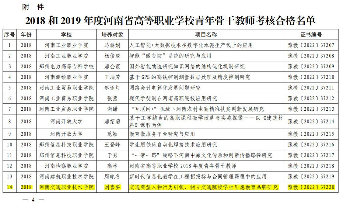 近日,河南省教育厅办公室发布《关于公布2018和2019年度河南省高等职业学校青年骨干教师培养对象考核结果的通知》(教办职成〔2022〕322号),公布全省高等职业学校青年骨干教师培养对象考核结果,我校刘喜要、张杰飞等8名教师顺利通过考核。