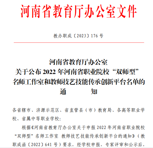 近日,河南省教育厅办公室下发《关于公布2022年河南省职业院校“双师型” 名师工作室和教师技艺技能传承创新平台名单的通知》(教办职成〔2023〕176 号),我校宁金成教授主持的道路与桥梁工程技术专业工作室获批“双师型”名师工作室,这是我校“双师型”教师团队建设取得的又一重大成果。