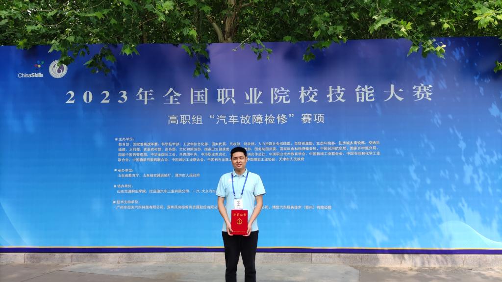 近日,2023年全国职业院校技能大赛高职教师组“汽车故障检修”赛项在山东潍坊举办。经过激烈角逐,我校教师王培从来自全国的60支代表队中脱颖而出,喜获大赛二等奖。