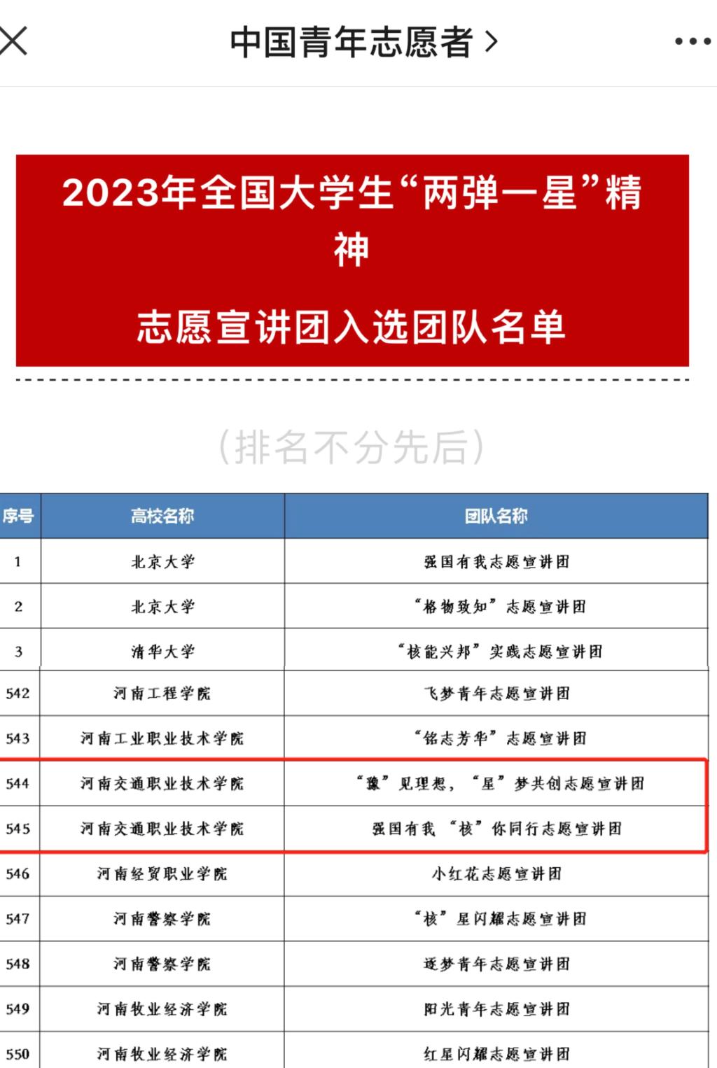 为深入学习宣传贯彻习近平新时代中国特色社会主义思想和党的二十大精神,落实“强国复兴有我”群众性主题宣传教育活动相关要求,动员引导青年学生大力弘扬志愿精神,团中央青年志愿者行动指导中心分别联合全国青少年井冈山革命传统教育基地、井冈山管理局、中国核工业集团有限公司组织开展了2023 年全国大学生井冈山精神志愿宣讲团、全国大学生“两弹一星”精神志愿宣讲团的遴选工作。我校共有四个团队成功入选2023年全国大学生志愿宣讲团。