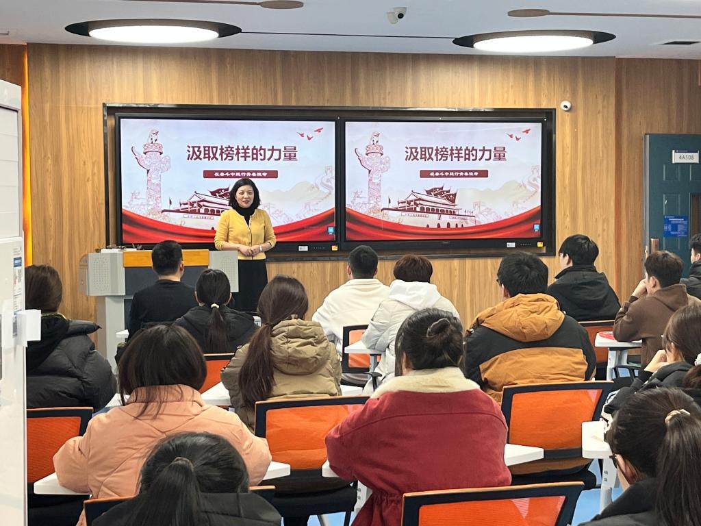 近日,副校长李菡以“汲取榜样的力量——在奋斗中践行青春使命” 为主题,在善学楼A座智慧教室为商务旅游系学生讲授思政课。