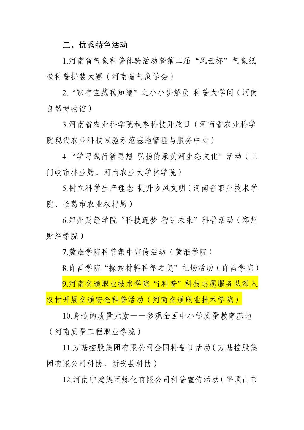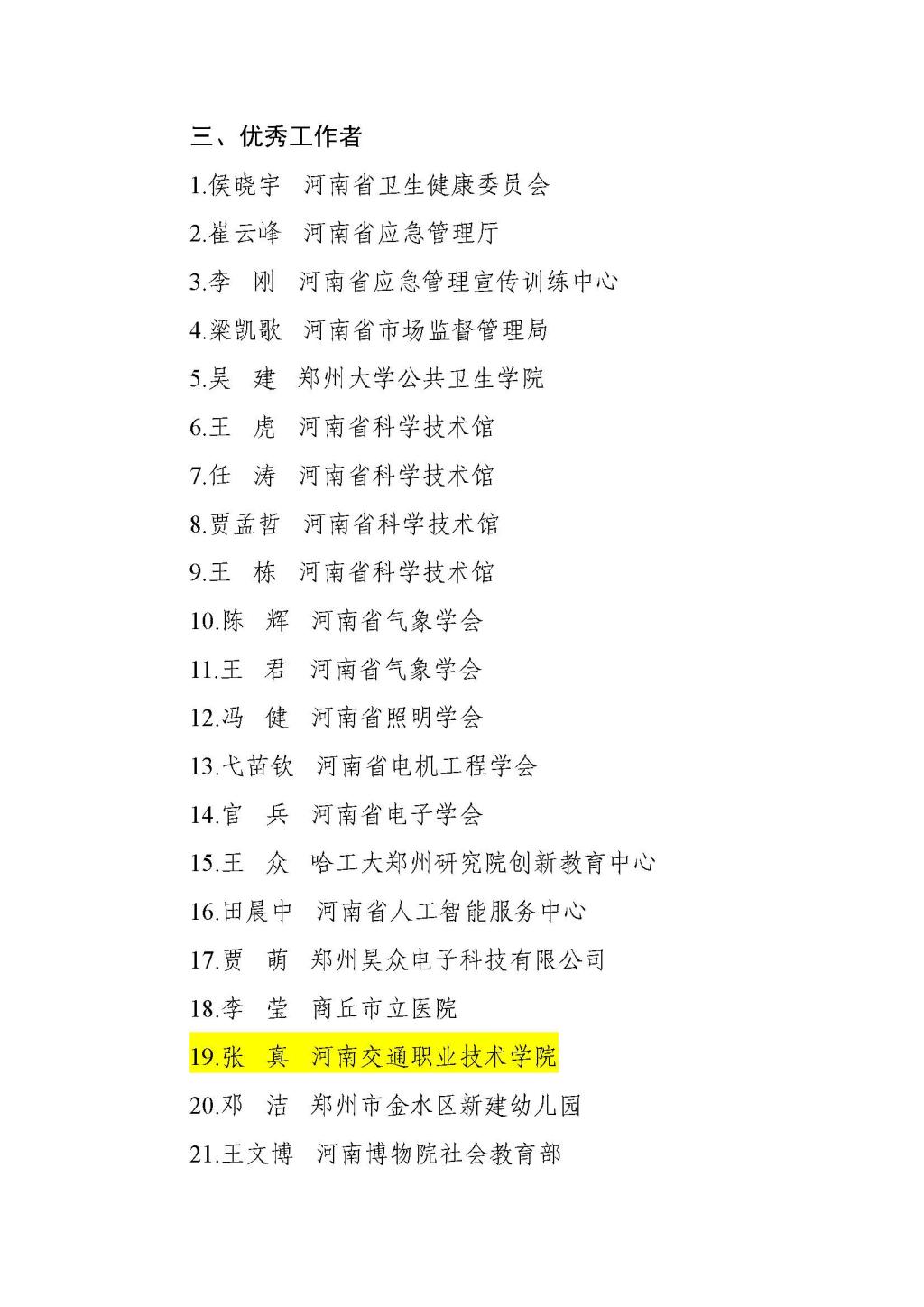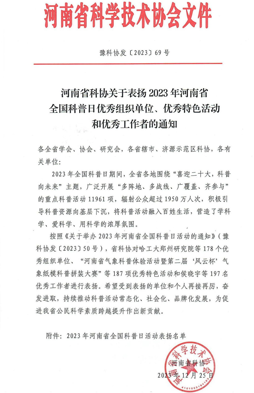 近日,河南省科学技术协会印发《河南省科协关于表扬2023年河南省全国科普日优秀组织单位、优秀特色活动和优秀工作者的通知》(豫科协发〔2023〕69号),对全国科普日期间,全省优秀组织单位、优秀特色活动和优秀工作者进行表彰。我校组织“i科普”科技志愿服务队深入农村开展交通安全科普活动获评“优秀特色活动”,交通信息工程系张真老师获评“优秀工作者”。