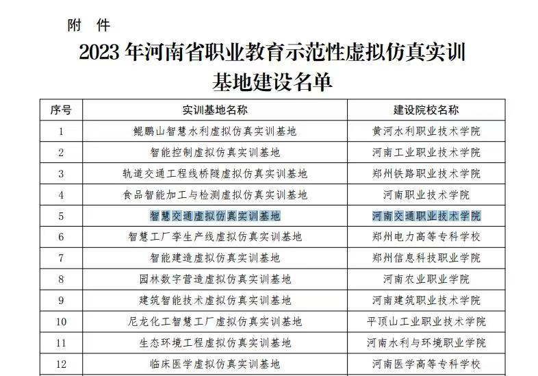 近日,河南省教育厅公布了2023年河南省职业教育示范性虚拟仿真实训基地建设名单,学校“智慧交通虚拟仿真实训基地”成功入选。