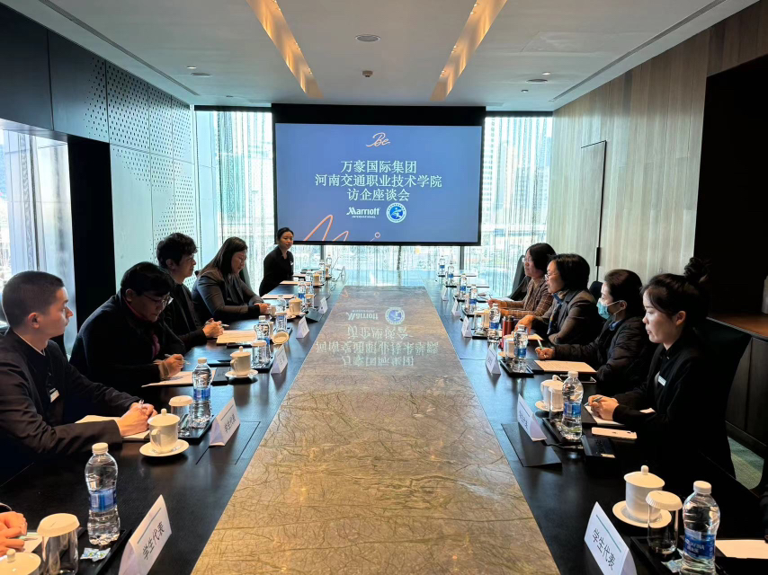 3月25日下午,副校长刘芝梅带队前往万豪旗下品牌酒店郑州建业艾美酒店,就推动智慧酒店产业学院相关事宜举行座谈,并亲切慰问在该酒店实习、留任的学生。万豪国际集团中国区校企关系经理朱程、郑州建业艾美酒店人力资源总监苌清,商务旅游系负责人等参加座谈会。